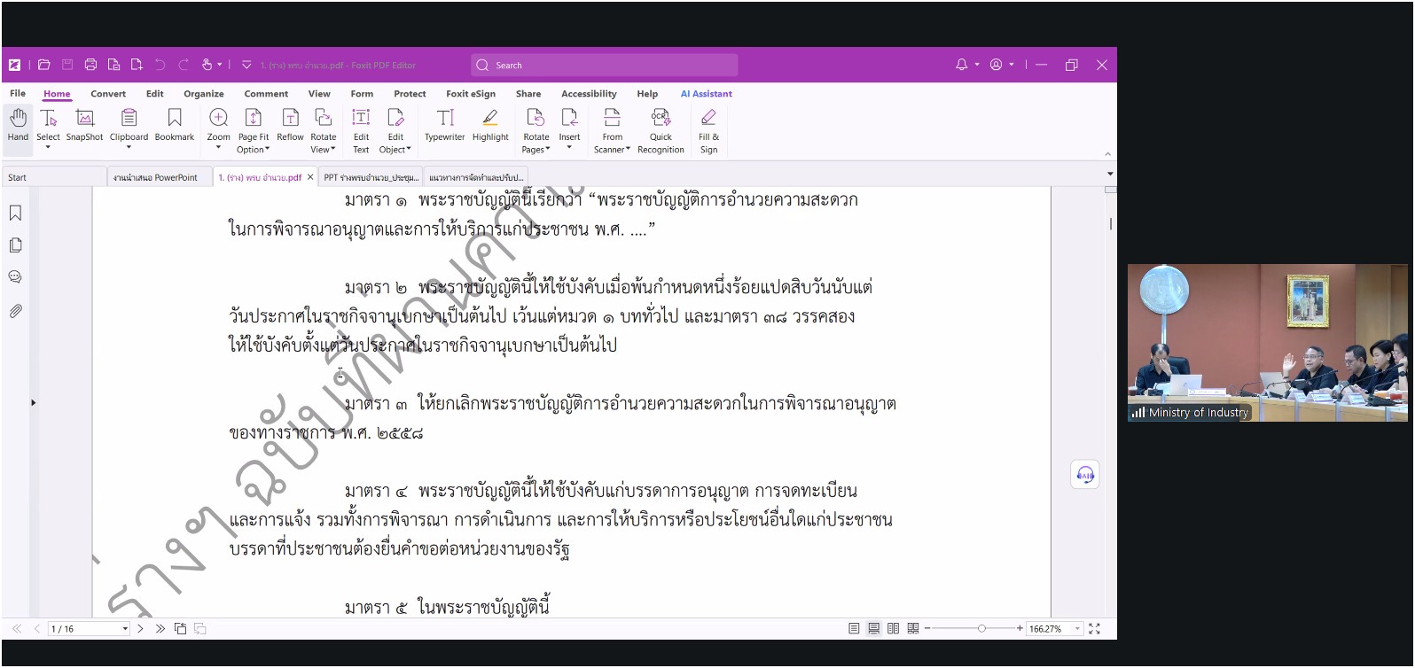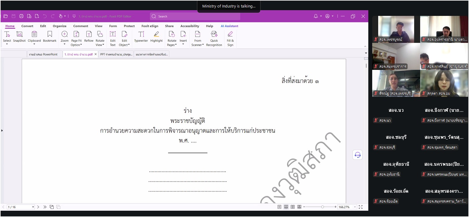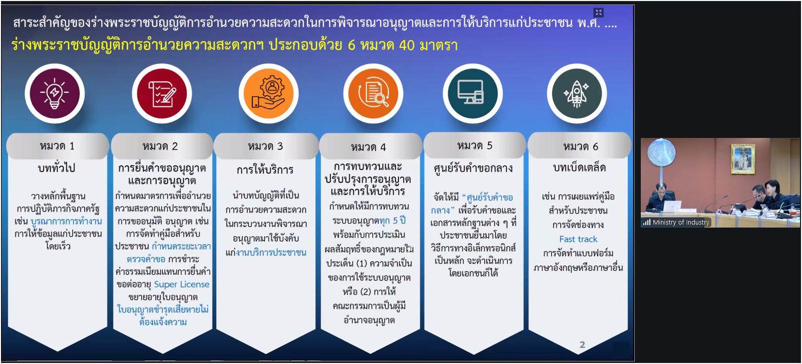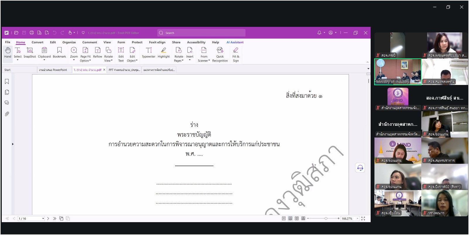 วันที่ 23 มีนาคม 2569 เวลา 09.00 น. นายกิติพงศ์ อติชาติพงศ์กุล อุตสาหกรรมจังหวัดพระนครศรีอยุธยา มอบหมายให้นางสาวกมลรัตน์ จิตตสินนวา นักวิชาการอุตสาหกรรมชำนาญการ และนางสาวสกุลตา แท่นงาม วิศวกรชำนาญการ เข้าร่วมประชุมการเตรียมความพร้อมการดำเนินการตามร่าง พ.ร.บ. การอำนวยความสะดวกในการพิจารณาอนุญาตและการให้บริการแก่ประชาชน พ.ศ.... โดยผ่านสื่ออิเล็กทรอนิกส์ (Zoom)